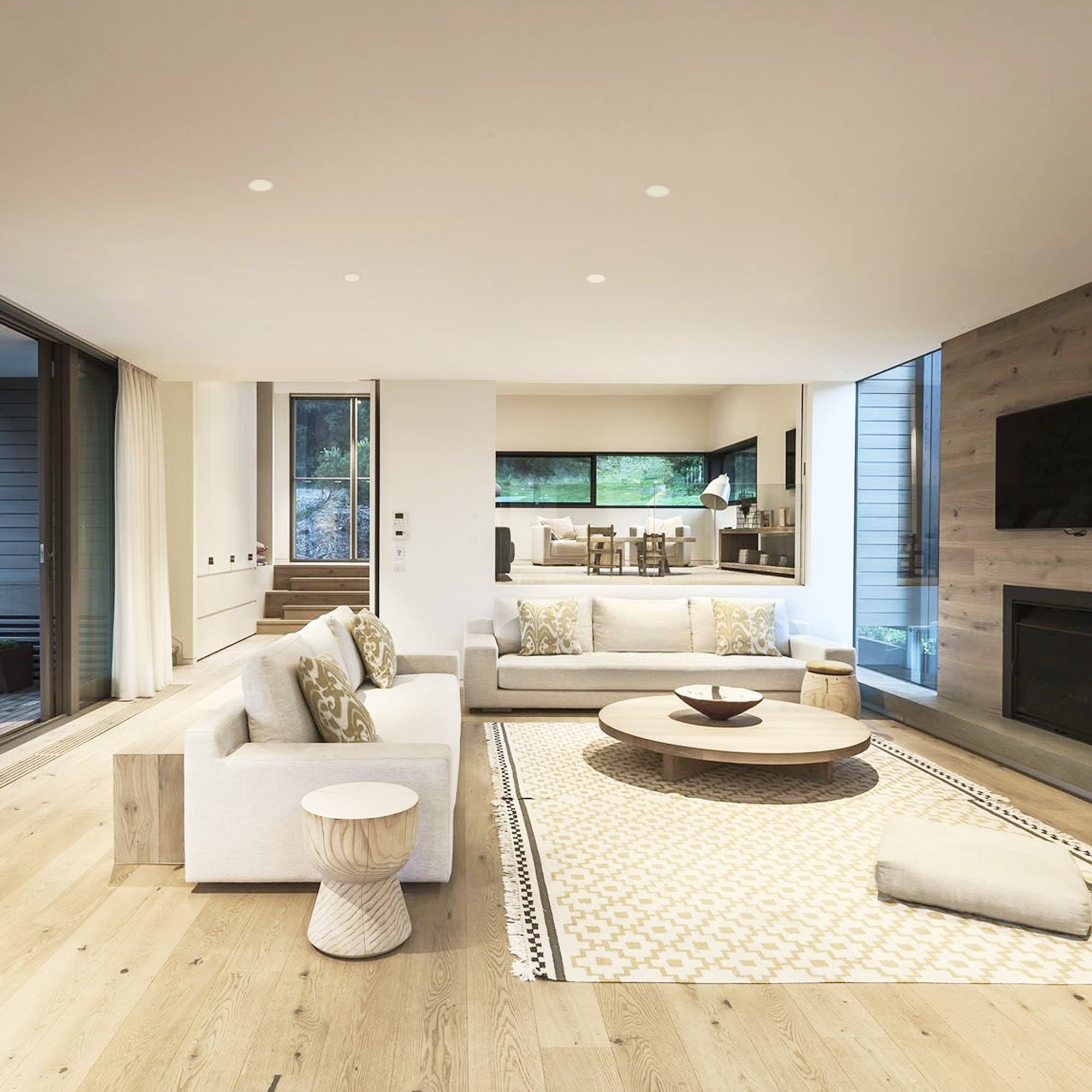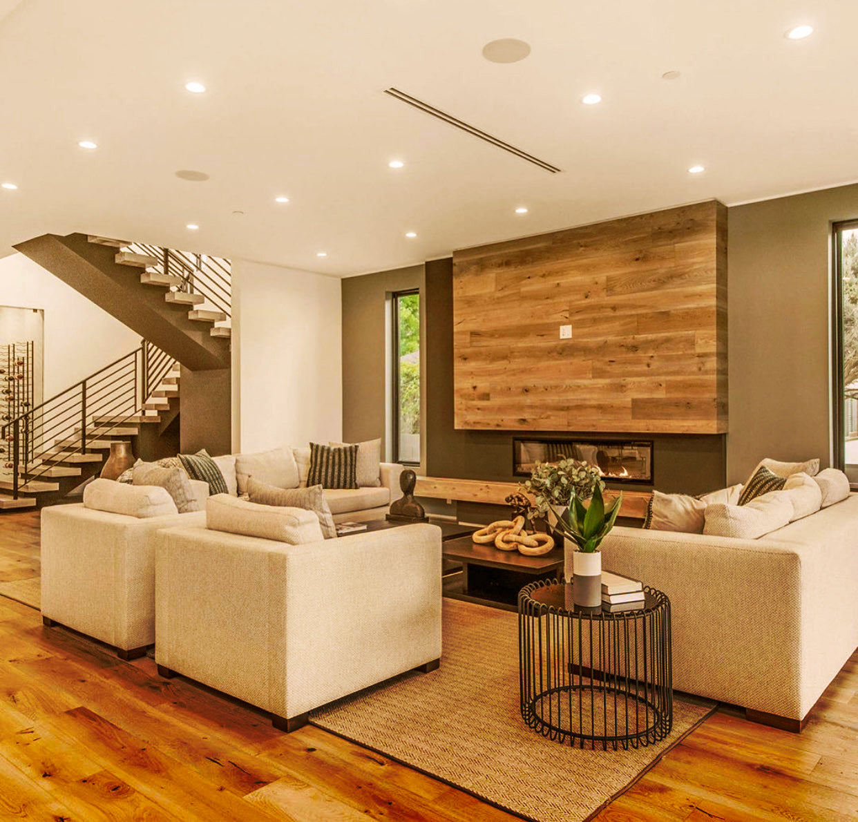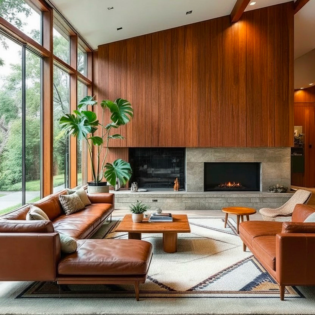 Here, lighting is not about spectacle but about extending the warmth of natural daylight into the evening. During the day, large windows let the room breathe with sun and shadows, while at night warm-toned lamps and sconces echo the richness of dark wood. Unlike minimalist living rooms that chase bright openness, this space embraces a heavier, grounded character, where light is meant to soften the mass of materials. Compared with luxury modern interiors, there is less focus on dazzling chandeliers and more on lamps that feel like part of the furniture language. The result is a layered, evening-friendly glow that respects the sturdiness of Farmhouse and the timeless elegance of Mid-Century.