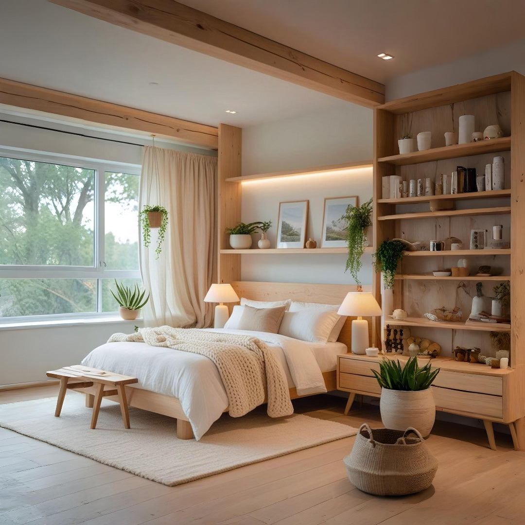The bedroom thrives on warmth and calm. Spotlights here are not about drama, but about directing gentle beams toward meaningful details — a plant, a piece of art, or the headboard’s texture. The use of warm light ensures the space feels restorative, unlike luxury modern bedrooms that may lean on striking chandeliers. Instead, light here blends into the background, reinforcing a quiet, nature-linked retreat.