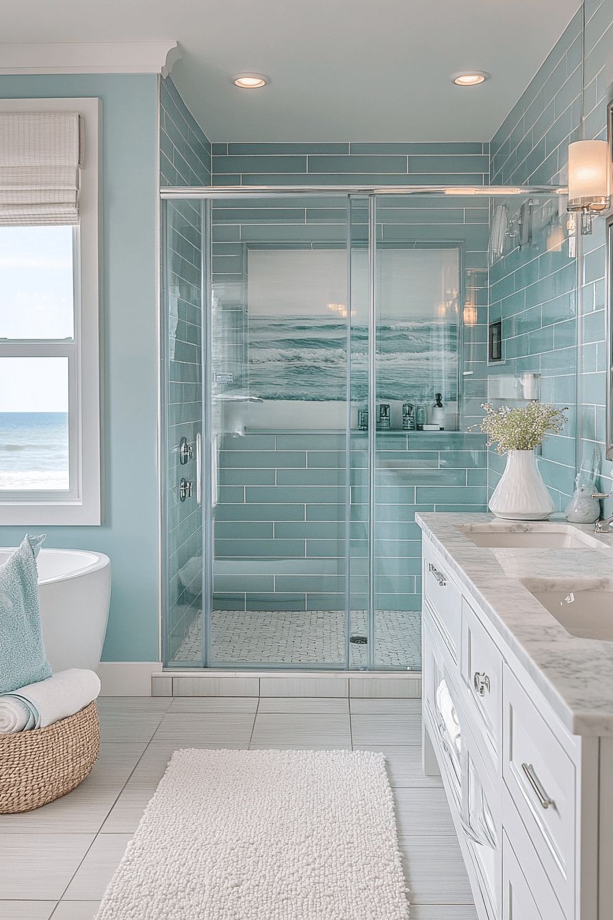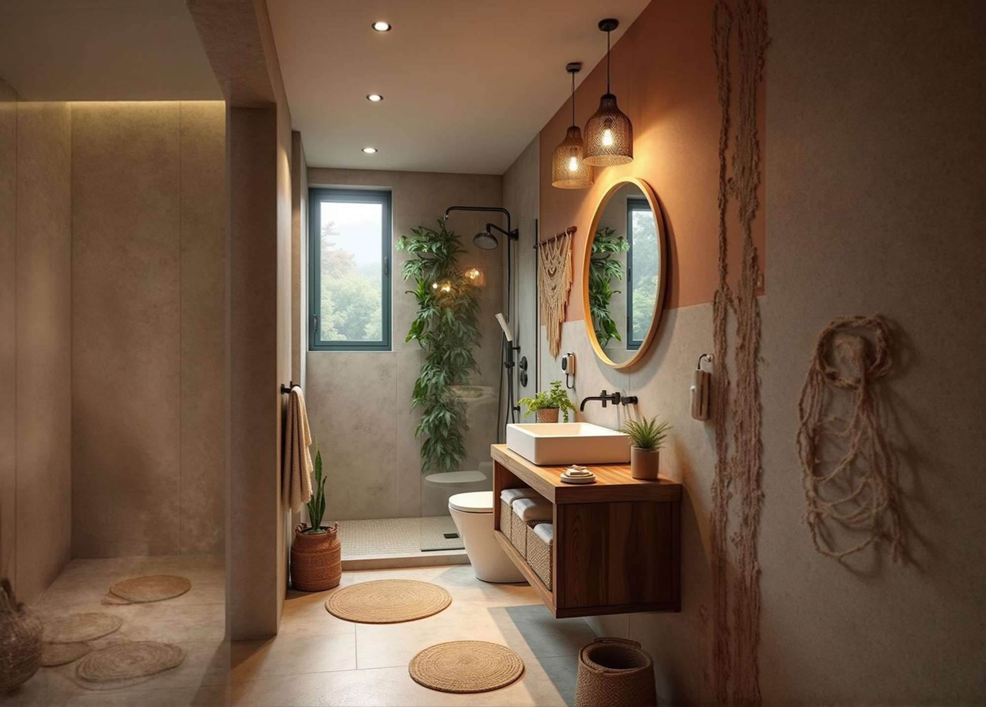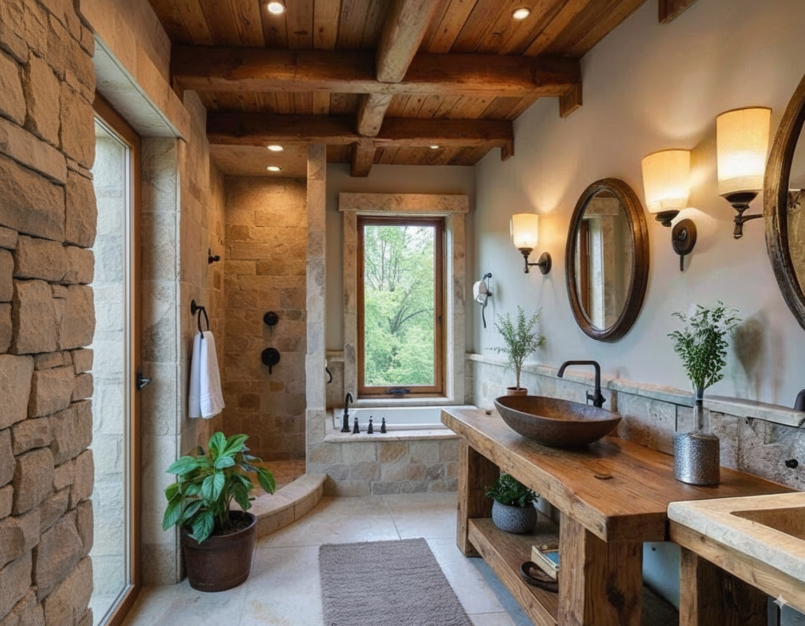 Here, lighting emphasizes the dialogue between rustic durability and crafted beauty. Warm waterproof fixtures ensure practicality, while sconces add character and soften stone or tile. Unlike modern bathrooms that aim for brightness and sleekness, this one leans on warmth and detail, where every beam enhances textures. Compared with Zen bathrooms that focus on stillness, this approach celebrates pattern, craft, and culture, turning the bathroom into both a retreat and a canvas of personality.