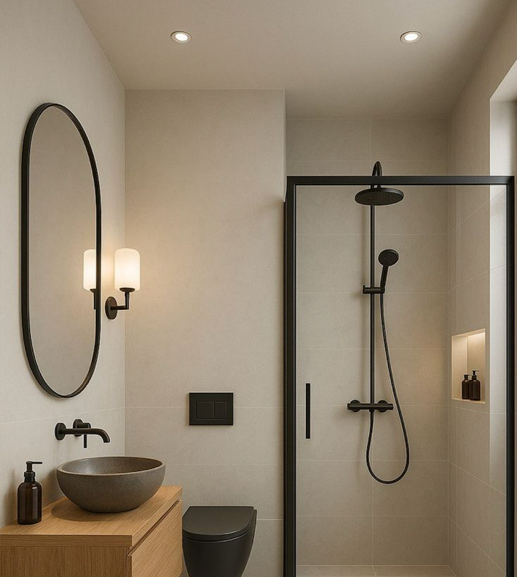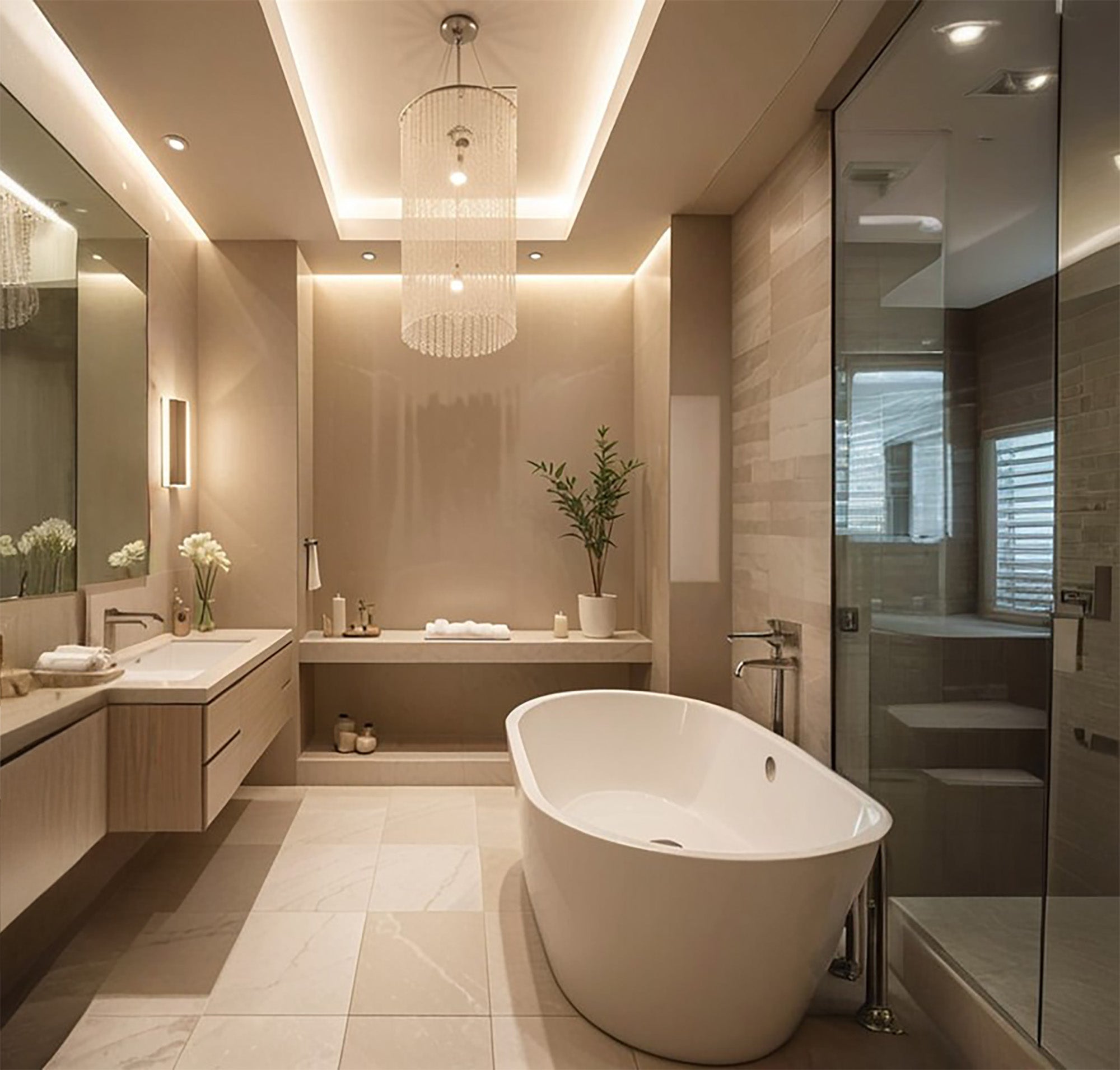 This bathroom effect is shaped by the meeting of Minimalism — with its focus on “less is more” simplicity — and Luxury Modern, which brings in refined finishes like marble, brass, and glass. The result is a space that feels clean, calm, and pure, yet quietly elegant. Straight lines and neutral colors ensure clarity, while carefully chosen materials add depth and sophistication. Lighting here is not only practical for daily routines but also creates a sense of comfort and indulgence, turning the bathroom into a private retreat.