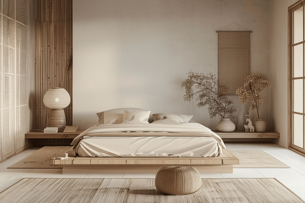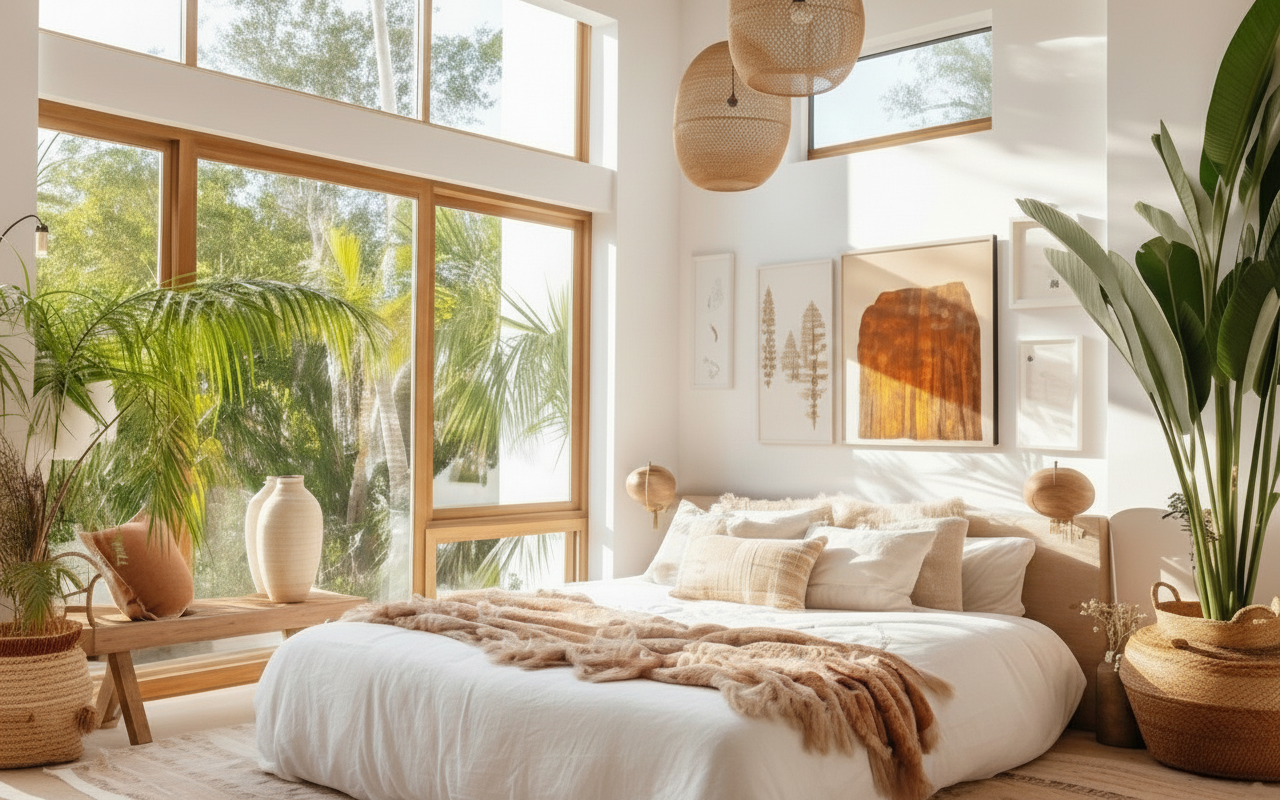 Wood tones, soft fabrics, and greenery shape a bedroom that feels calm, airy, and quietly refreshing.
