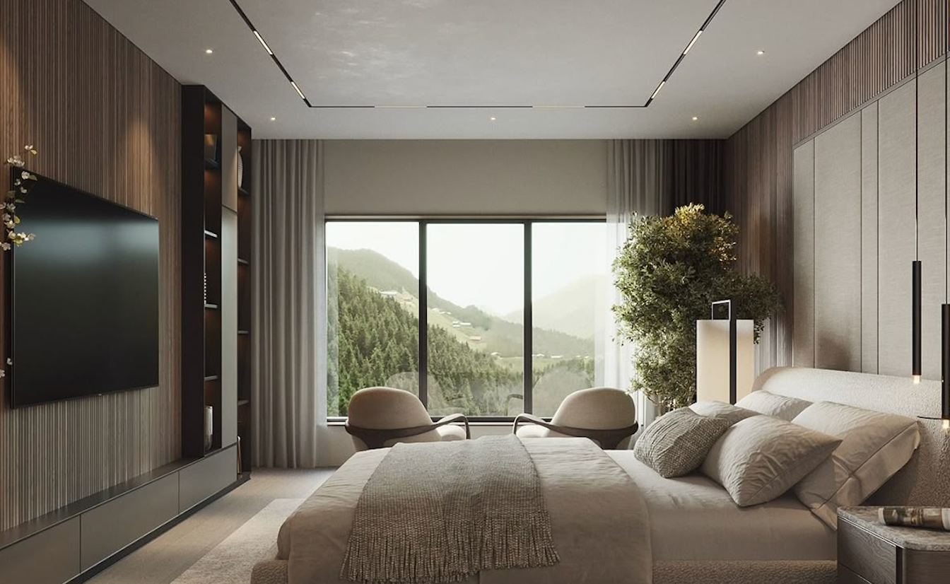 This bedroom blends Minimalism’s clarity with Luxury Modern’s refined materials, resulting in a space that is serene yet sophisticated. Neutral tones, clean lines, and thoughtful lighting transform it into a restful sanctuary.