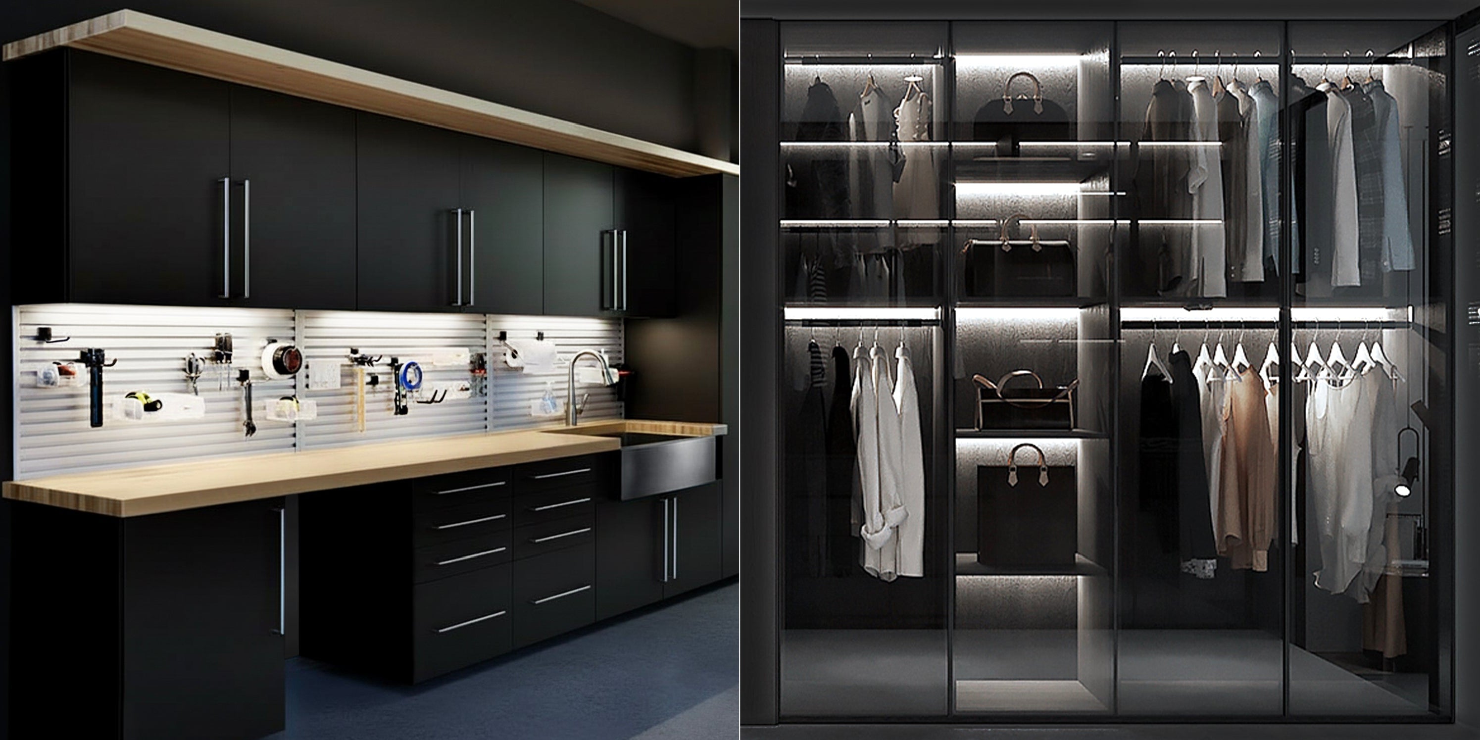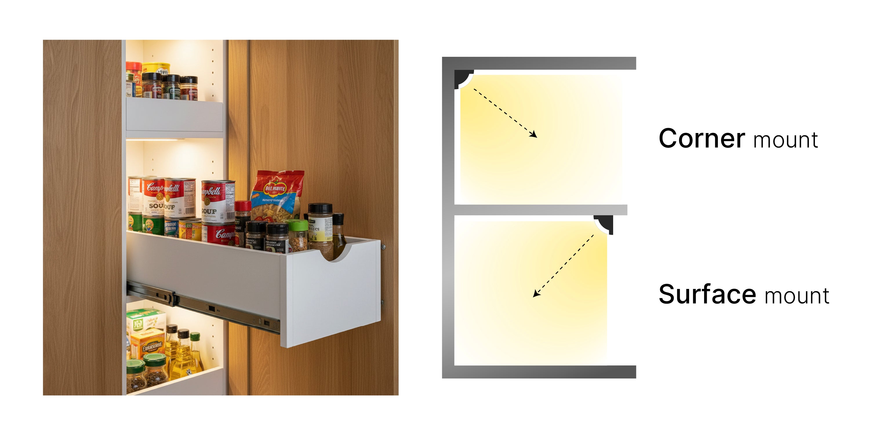 Low Profile Lighting Kit for Gun Safes, Cabinets, and Storage Spaces 45° angle installed lighting system with flexible connectors for safe, shadow-free visibility inside gun safes, showcase, and storage cabinets.