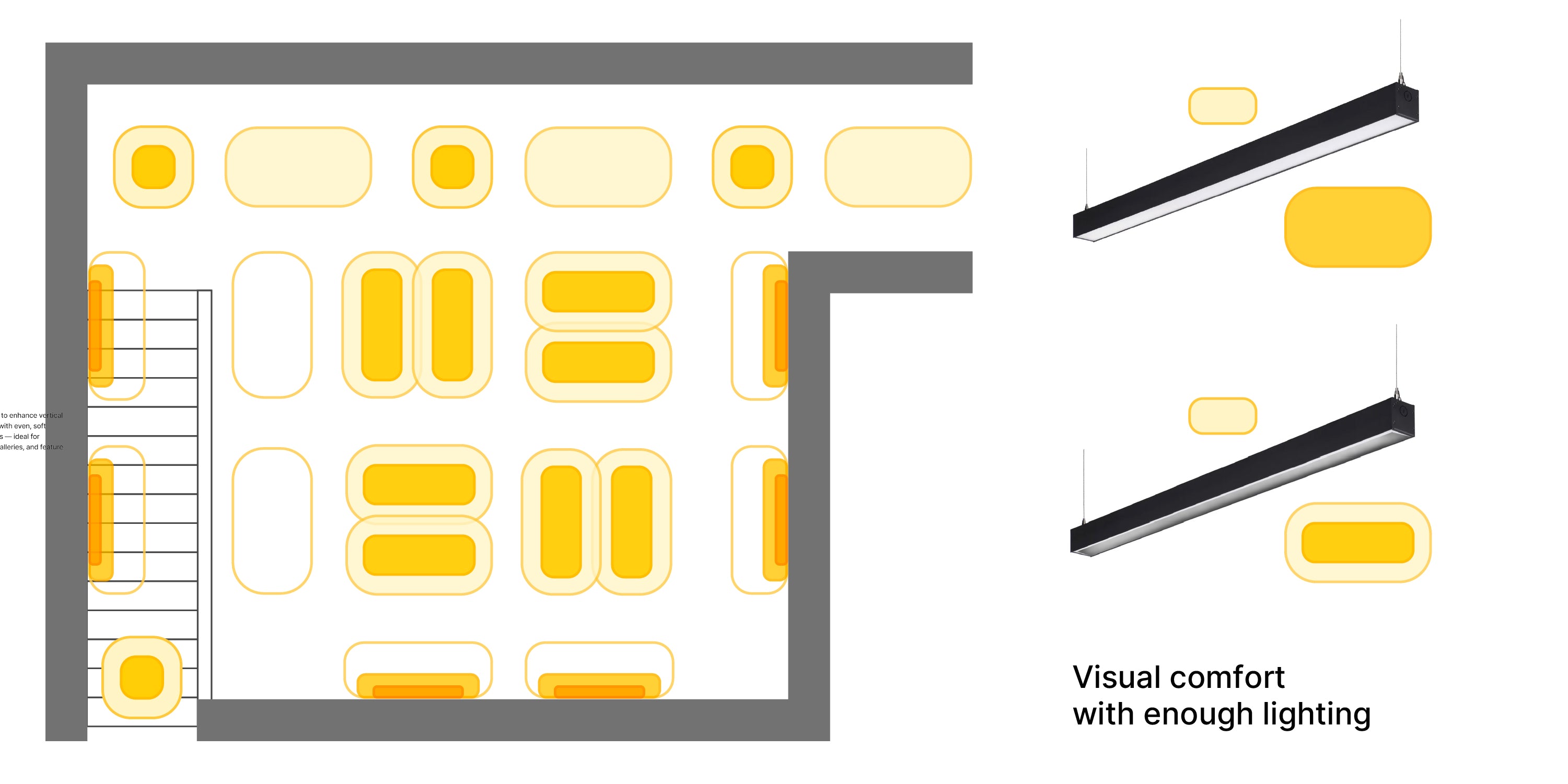 It offers wide, evenly distributed illumination for open spaces and collaborative environments. It ensures broad, glare-free lighting coverage suited for offices, studios, and large interior layouts.