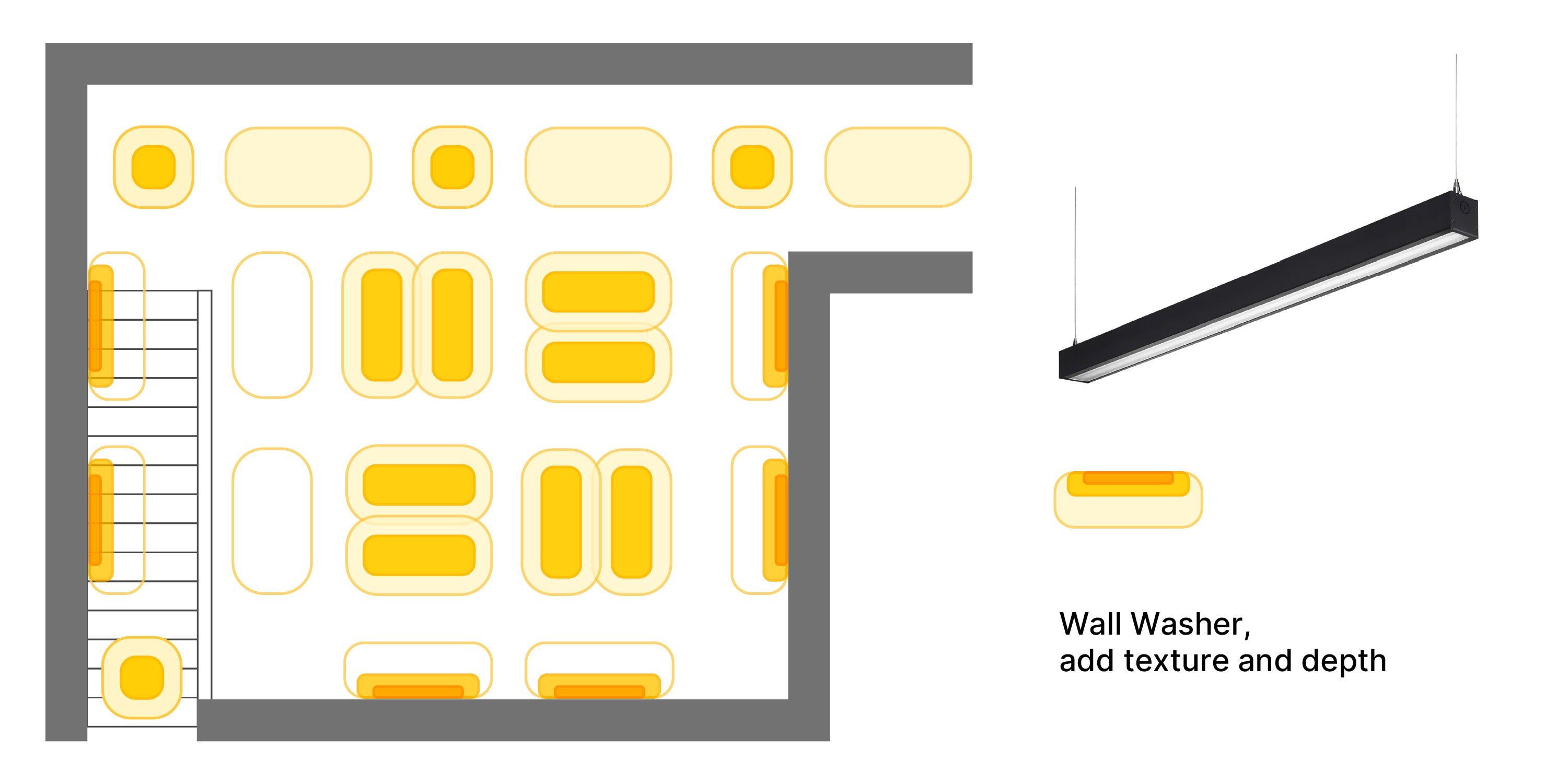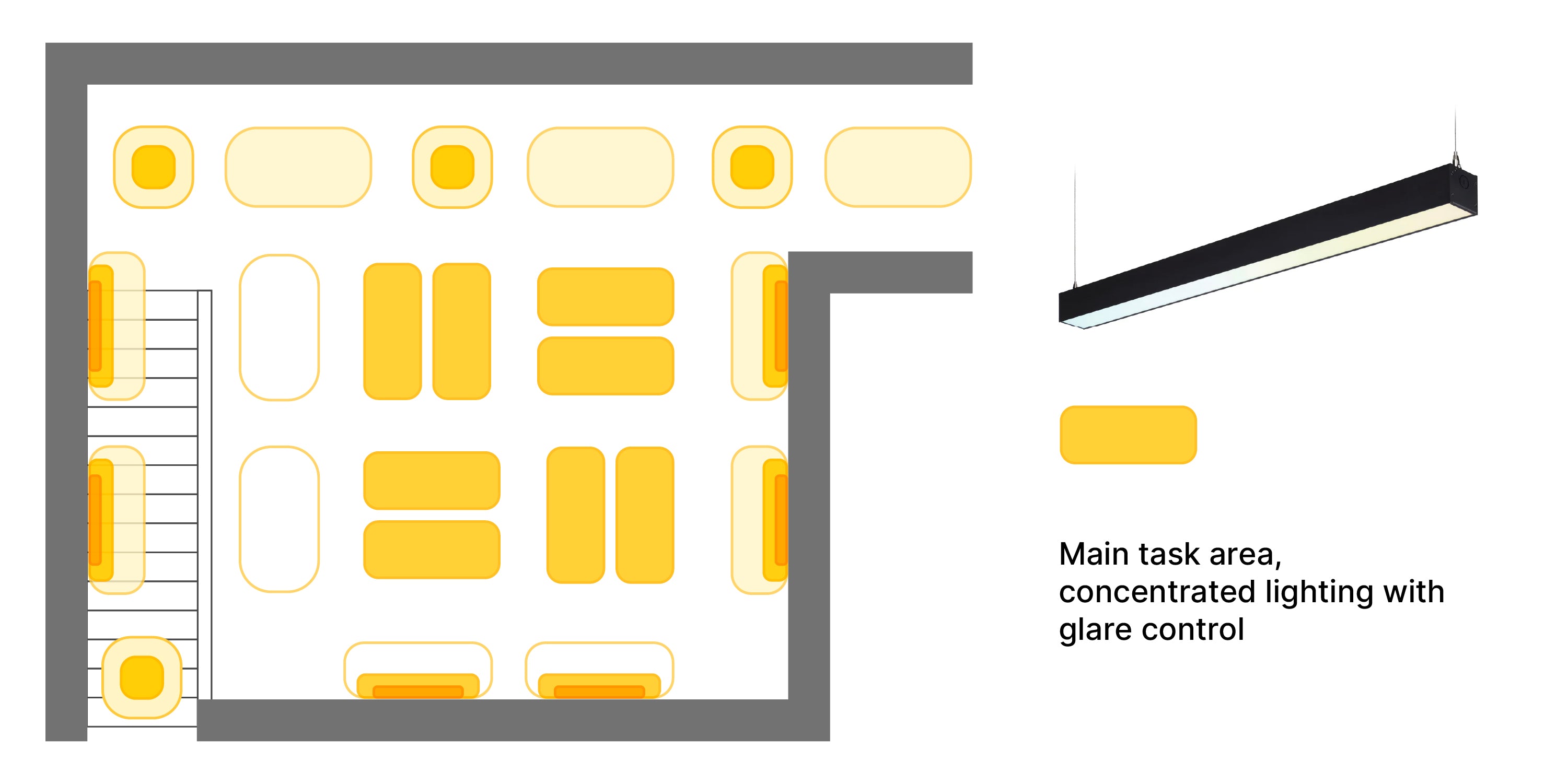 Up and down lighting creates layered brightness, enhancing architectural depth while maintaining workplace functionality.