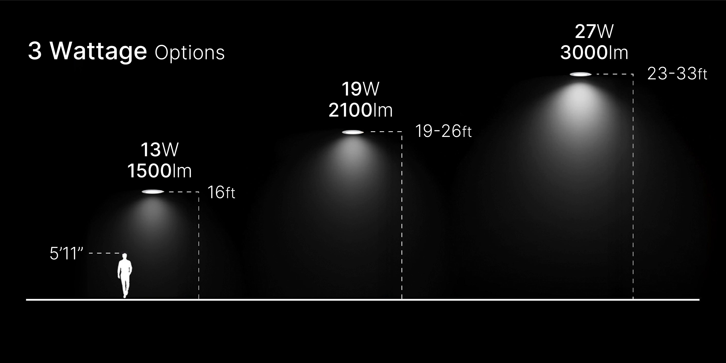Delivers powerful, efficient illumination with wide coverage and visual balance. Ensures consistent brightness from greater heights spaces.